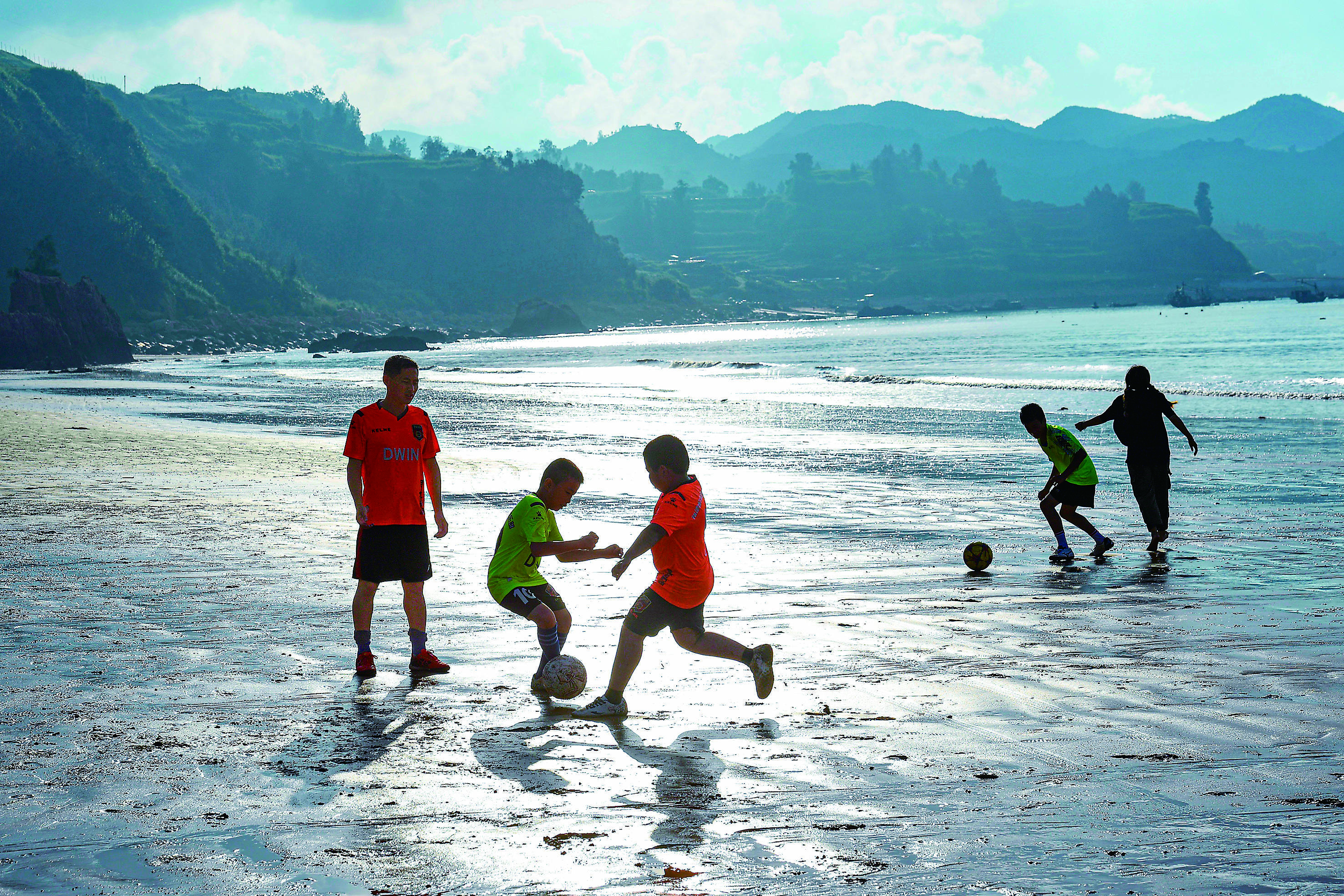 霞浦县下浒镇外浒沙滩上,“长风”足球队小球员们在海边踢球。新华社记者姜克红摄“舶来”足球火种相遇霞浦娃娃