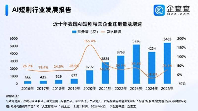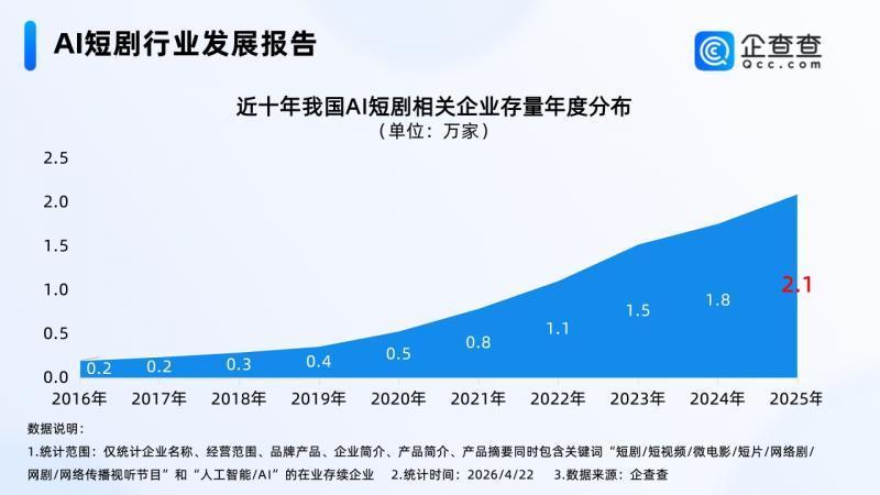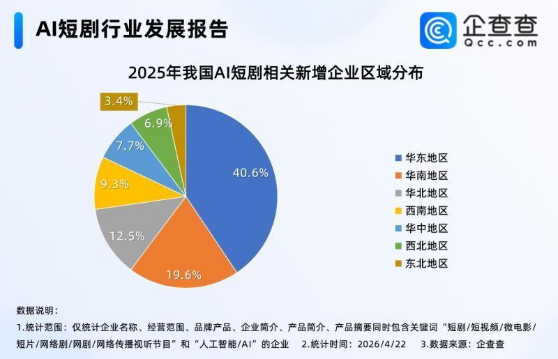 企查查数据表示,2025年全年,我国累计注册5465家AI短剧有关企业,同比加多28.5%,创近十年有关企业注册量新高;区域漫衍上,华东地区2025年有关企业注册量最高,占比超四成;已毕4月22日,2026年我国已注册1637家AI短剧有关企业。企业存量方面,已毕2026年4月22日,我国现有2.2万家AI短剧有关企业。
